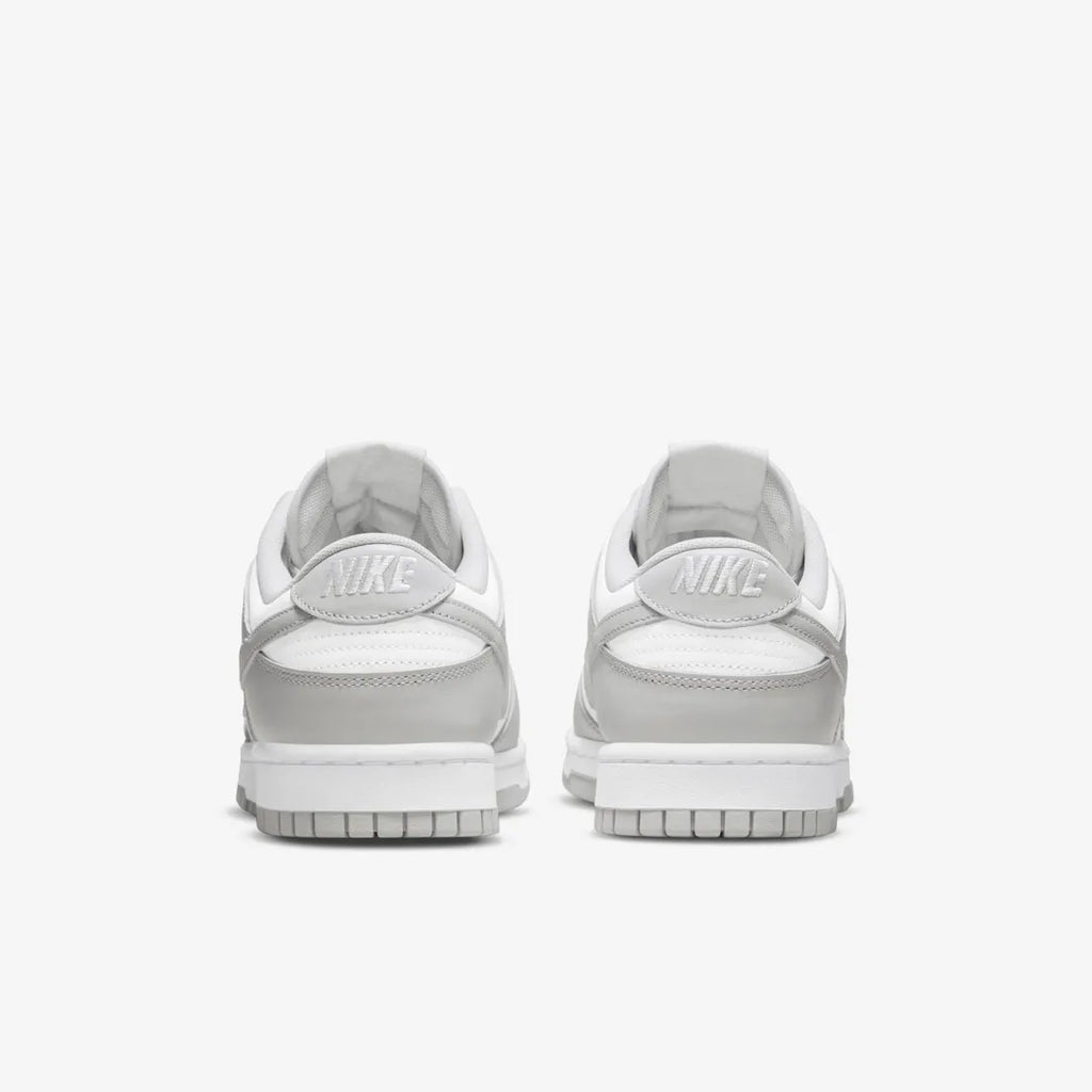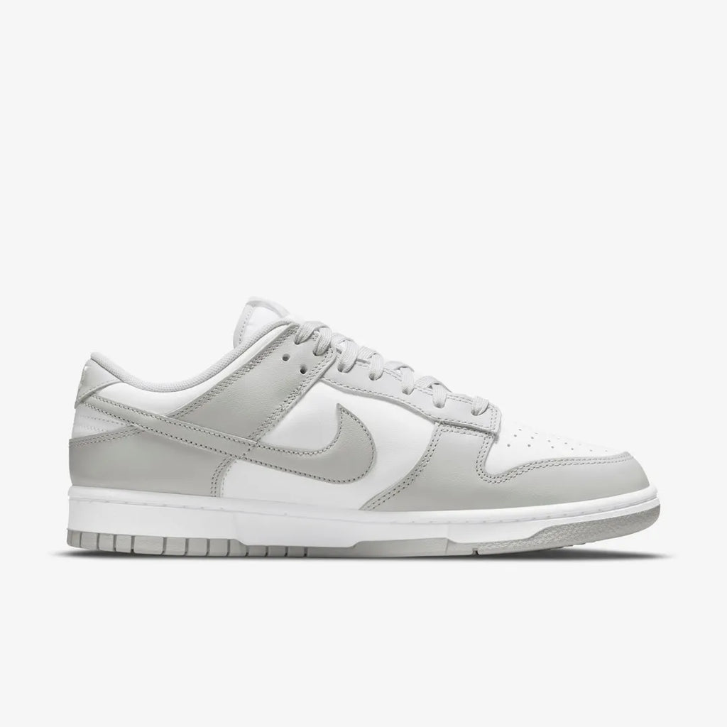 O Dunk Low Grey Fog apresenta uma parte superior de couro branco com sobreposições de couro Grey Fog e Swooshes. A partir daí, uma etiqueta de língua tecida, aba de calcanhar e sola combinando completam o design.