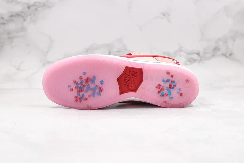 O Nike SB Dunk Low "Strangelove" é uma verdadeira obra-prima, resultado da colaboração com a marca Strangelove Skateboards. Com um cabedal em veludo vermelho vibrante, o tênis se destaca pelo toque luxuoso e ao mesmo tempo irreverente. O contraste entre o tom quente do vermelho e os detalhes em preto e dourado cria um visual sofisticado, enquanto o gráfico de coração quebrado na parte lateral remete à atitude irreverente e criativa do skate.